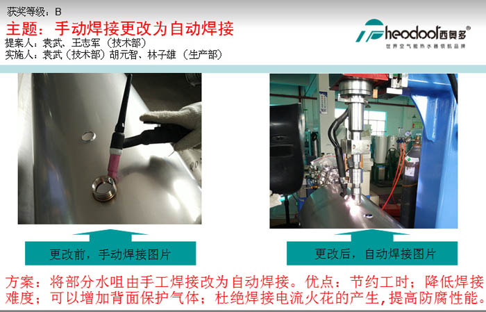 蘇:生產(chǎn)部在今年1月至9月共提出“持續(xù)改善”點1314條,約占公司總改善點的60%。改善的內(nèi)容包括:工藝技術(shù)、現(xiàn)場管理、節(jié)約耗能等等,例如:由手動人工焊接操作改進為自動焊接操作,焊接工藝已達成熟,進一步提高產(chǎn)品質(zhì)量。