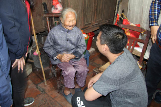 這位老奶奶105歲,兒子已離世,只有孫子,患有腿疾走路不便??吹酱蠹遥f話有些激動。
