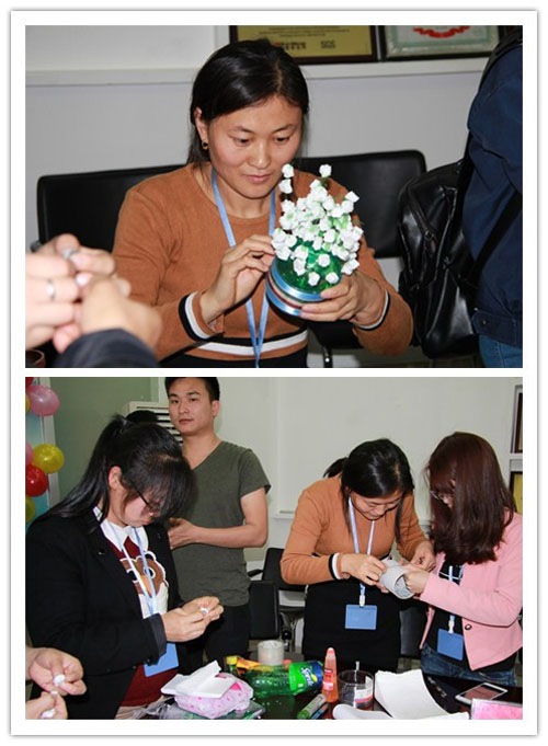 來自品質(zhì)部的參賽者,將飲料瓶、膠圈芯、泡沫等廢棄材料化身為又美麗又實用的筆筒、盆花。
