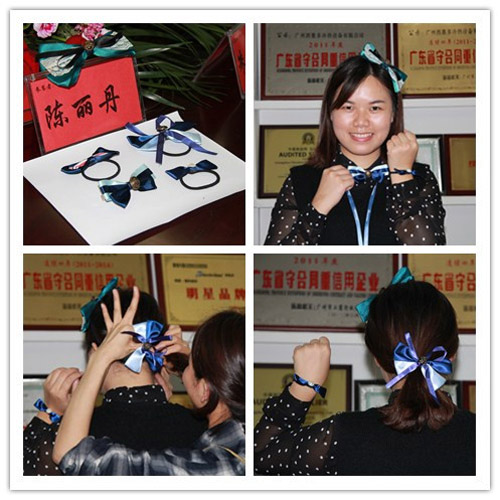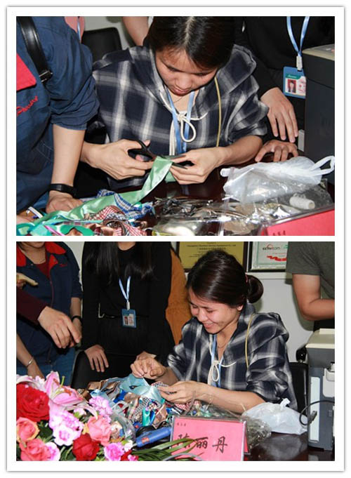 來自財務(wù)部的美女心靈手巧,利用邊角布料、橡皮筋和相關(guān)工具,就能設(shè)計制作出各式各樣的發(fā)夾、發(fā)箍和手花等精美飾品。
