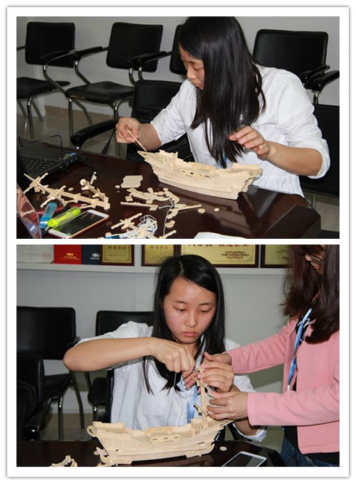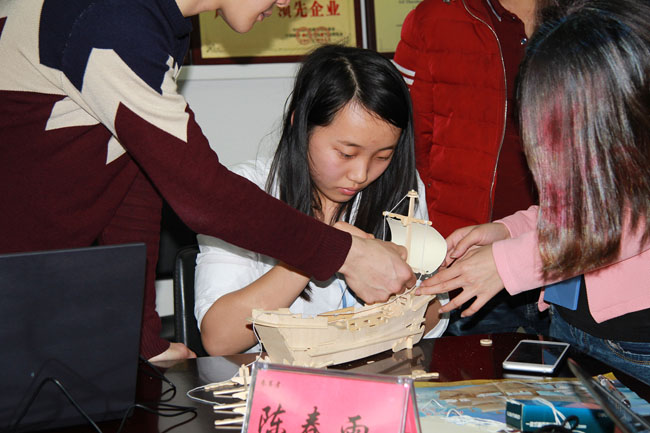 來自人力資源部的參賽者,現(xiàn)場組裝一艘帆船。哇,上百塊的零散部件!組裝不簡單啊。