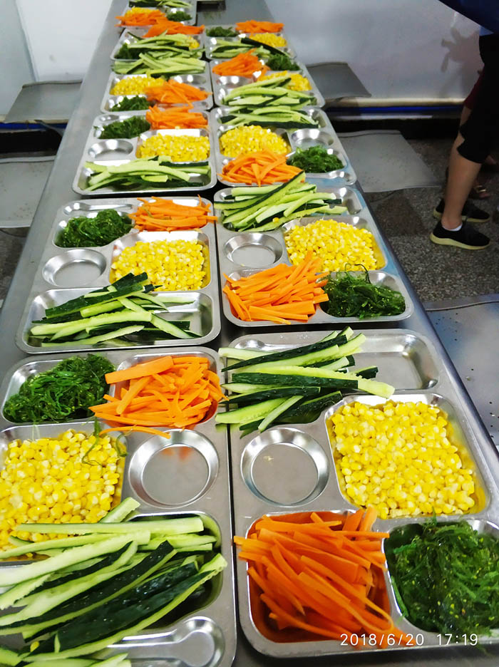 當(dāng)天17:00,小吃貨們翹首期盼的時(shí)刻終于來(lái)了。大家分工合作,帶上手套切食材,將材料按組分配。