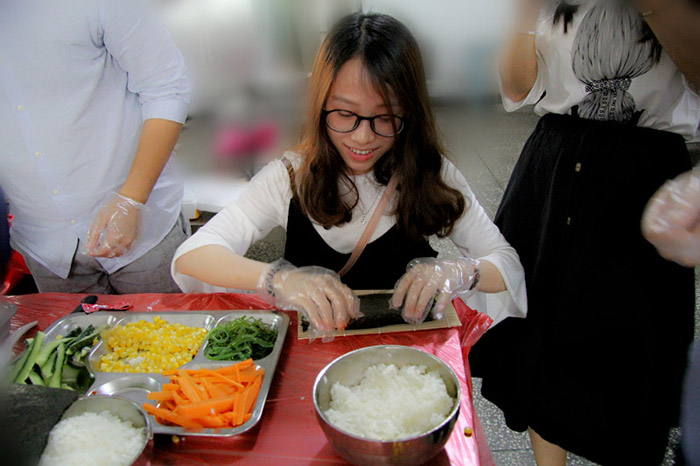 食材貴在新鮮。除了海藻、黃瓜、胡蘿卜、玉米、火腿腸、肉松等食材,還有芥末醬、沙拉醬等各種調(diào)料兼顧眾人的口味……色彩繽紛,香味誘人。