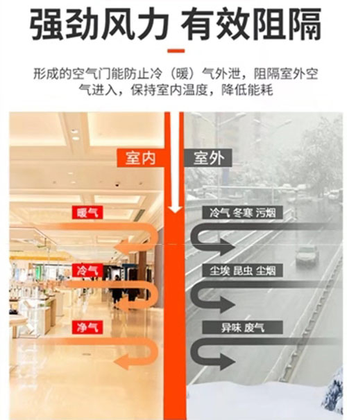 風(fēng)幕機(jī)的高速氣流隔離油煙、異味,有效地阻擋室外蚊蠅、灰塵進(jìn)入室內(nèi),保持食品車間的干凈衛(wèi)生。除此,還防止室內(nèi)外冷熱空氣交換,“空調(diào)好伴侶”起到節(jié)能省電的作用。