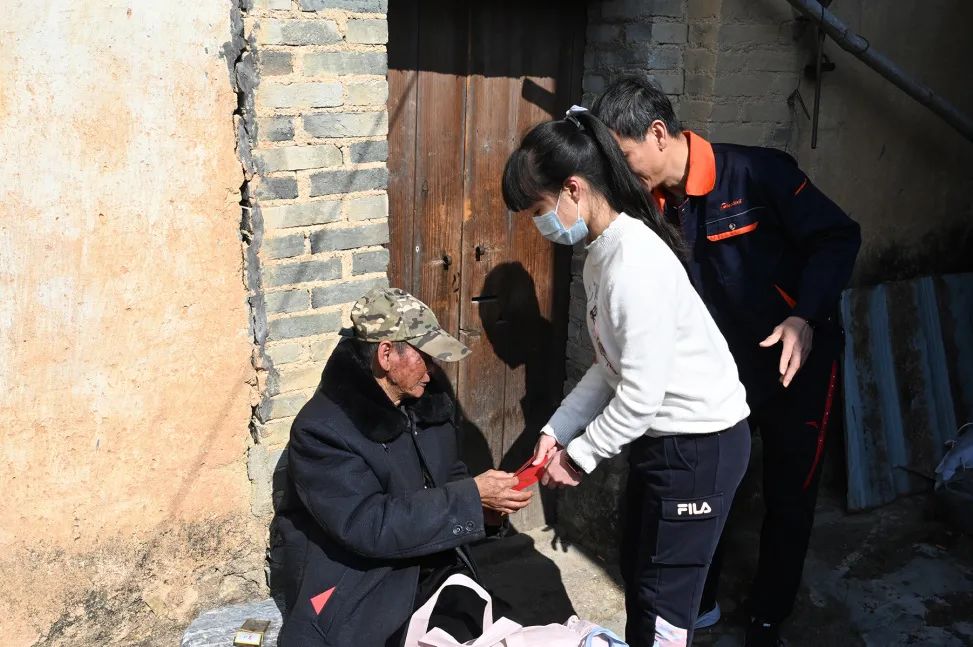 公司為老人們送上慰問金紅包,以及棉被、食用油、大米、香菇、面食等生活物資。