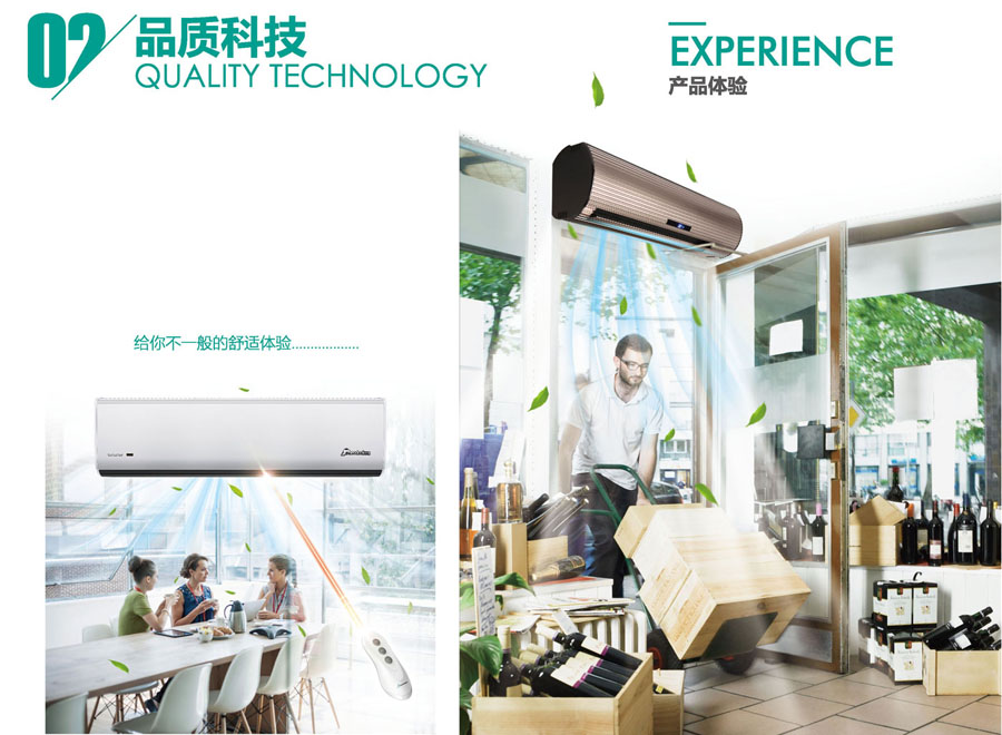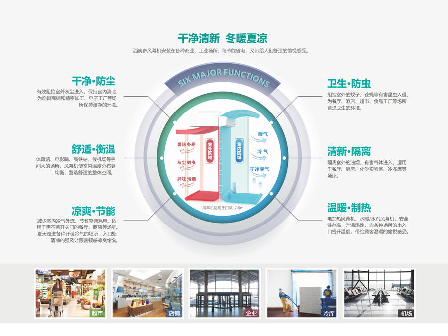 減少室內(nèi)冷氣外流,節(jié)省空調(diào)耗電,適用于需不斷開(kāi)關(guān)門的餐廳、商店等場(chǎng)所。夏天走進(jìn)各種開(kāi)設(shè)冷氣的場(chǎng)所,入口處清涼的強(qiáng)風(fēng)讓顧客頓感涼爽愉悅。