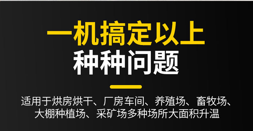 適用于烘房烘干、廠房車(chē)間、養(yǎng)殖場(chǎng)、畜牧場(chǎng)、大棚種植場(chǎng)、采礦場(chǎng)多種場(chǎng)所大面積升溫。